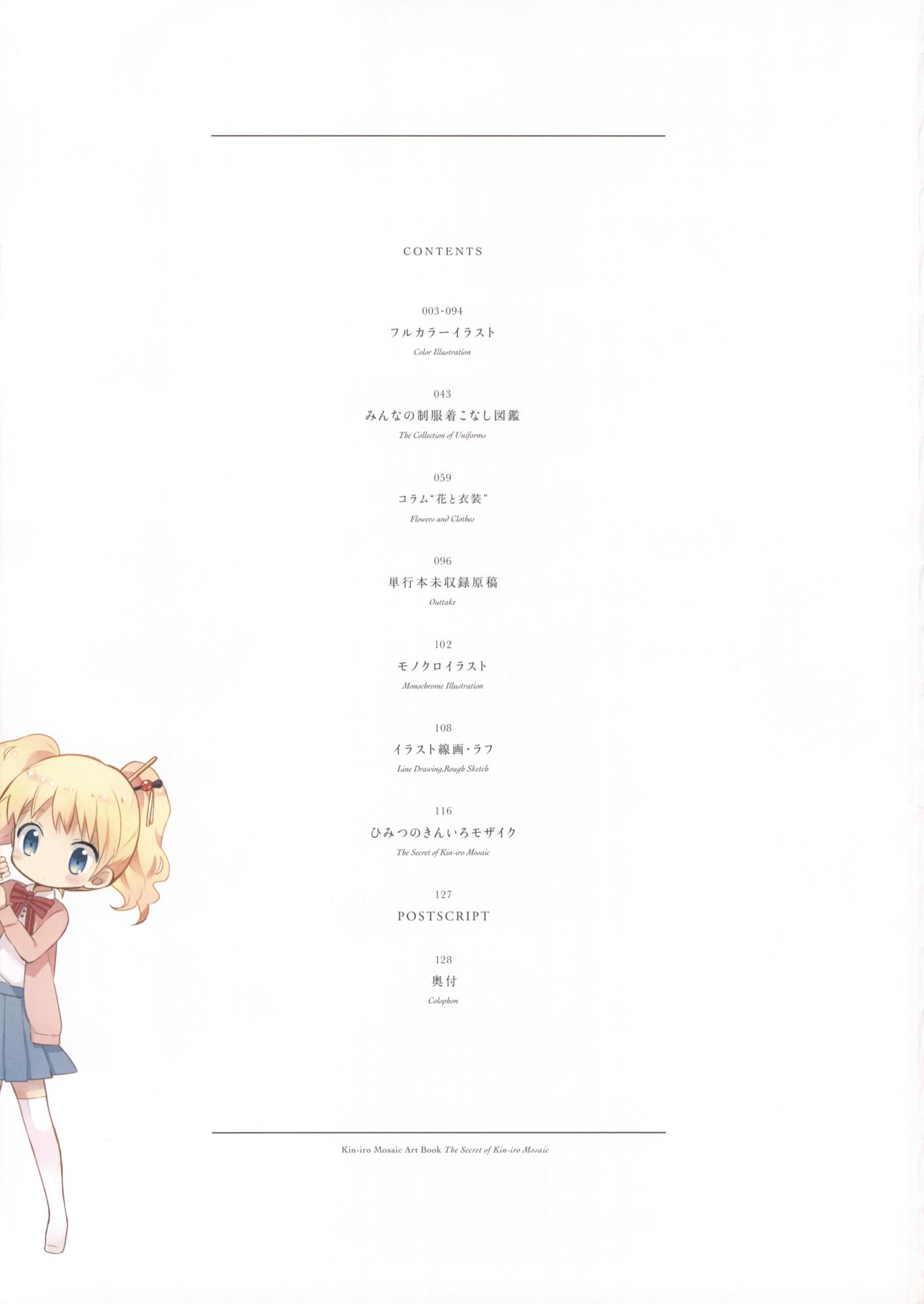 きんいろモザイク画集 ~ひみつのきんいろモザイク~ (発売) まんがタイムKRコミックス 原悠衣 isbn: 定価:2619円(10%税込) 原悠衣初画集にして、永久保存版の1冊がついに登場。 これまでに描かれた数々の「きんいろモザイク」カラーイラストを一挙収録のほか 「図書カード」『きんいろモザイク』まん | 「ファンブック モザイクのかけら」『きん ブログトップ きんいろモザイク画集 ~ひみつのきんいろモザイク~今まで"ひみつ"だった各ヒロインの初期設定資料集等も!<送料無料選択可> おそらく表紙の画像だと思うけど 純白のドレキャラクター:Characters ヘルプ キャラクターについて 誕生日の設定があるキャラクターのみ;
